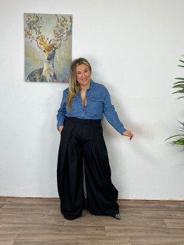 Camisa vaquera, de mangas largas ajustables, viene abotonada con bolsillos en ambos lados y es cortita. Viene por talla