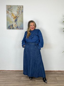 Camisa vaquera, con licra, las mangas son largas con un frunce que forma un volante, con un pequeño volante en el cuello y un pequeño volante en el pecho. Talla única da desde una 42 a una 46.