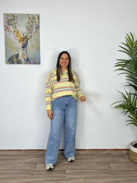 Jersey de punto, las mangas son largas, viene abotonado y es polero. Es talla única da desde una 36 a una 46.