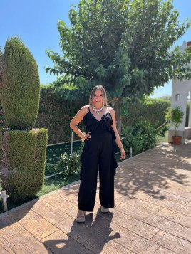 Mono de tirantas finas ajustables, con el escote de pico, tiene volantes por la parte del pecho, el corte del pantalón es recto, tiene volantes caídos a los laterales y tiene una lazada en la parte de la espalda. Talla única da desde una 36 a una 40.